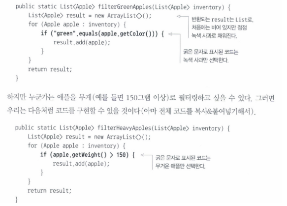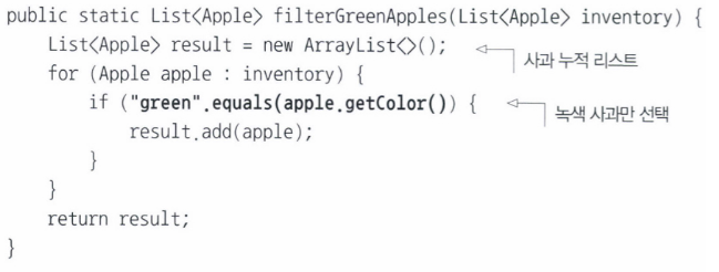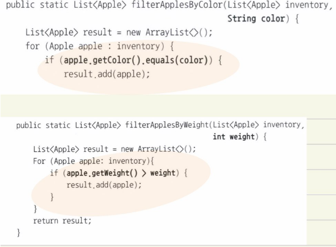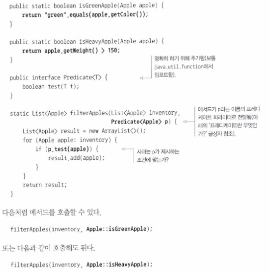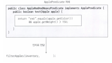 결론 : Applepredicate를 상속받는 특정 객체를 filterApples 에 전달하면서