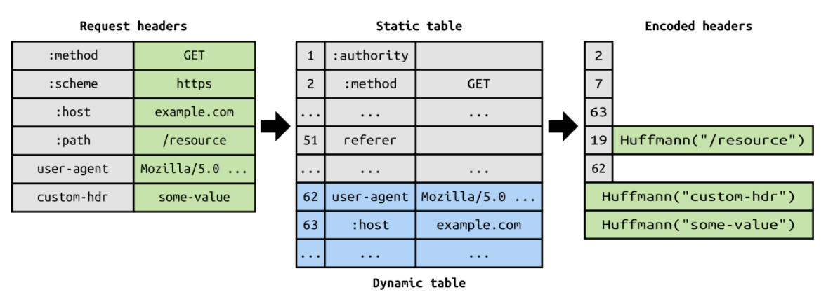 반면 HTTP/2는 Static/Dynamic Header Table 기법을 사용하여 중복 Header를 검출하고