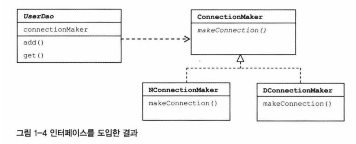 인터페이스를 사용한다면 UserDao는 connectionMaker 인터페이스가 makeConnection()이라는 기능을 가지고 있다는 것에만 관심을 갖지 해당 기능이 어떻게 구현되는지는 관심을 갖지않는다.