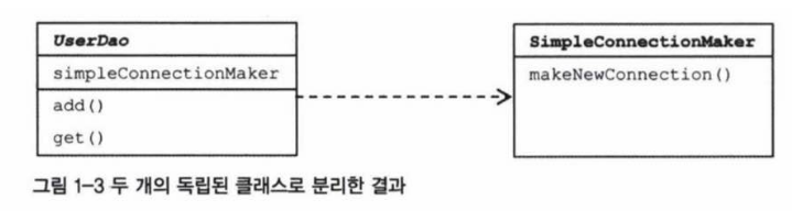 단점 : UserDao 가 SimpleConnectionMaker라는 클래스에 종속적이게 되므로 향상된 방법이 아님