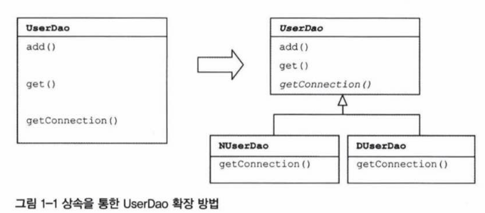 UserDao에 있던 메소드를 추상클래스로 변경하여 실질적인 구현을 하위 클래스인 NUsereDao, DUserDao에서 구현