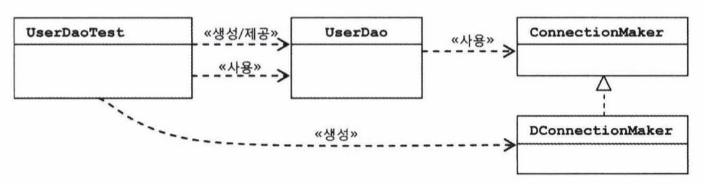 UserDaoTest는 UsesrDao와 런타임 오브젝트관계를 유지시켜준다.